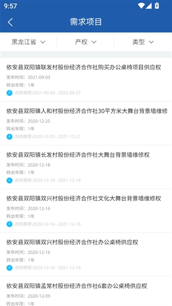3、在需求项目界面下,我们能够获得相应的项目信息,可以根据产权、类型自由筛选。
