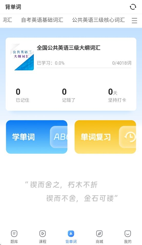 页面上方可以选择不同考试类型的单词内容,用公共英语三级、学位英语、英语四级、自考英语等。
