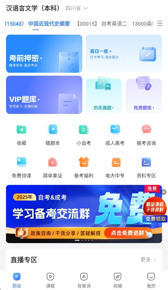 用户可以在此界面查询各种科目的题库、预约学习直播、自考资讯,各种考试查询和备考技巧等等功能。界面上方可以更改省份,选择不同的考试内容以及专业。
