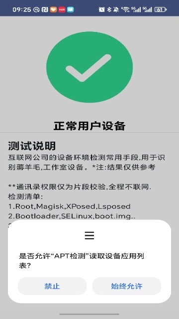 当弹出 “是否允许‘APT检测’读取设备应用列表”的权限请求时,根据需求选择 “禁止”或 “始终允许”,以保障检测功能的完整性。