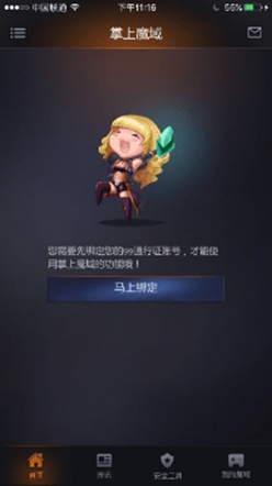 3)登录后请在提示说明下操作,绑定99通行证帐号,绑定成功后即可使用掌上魔域的所有功能。