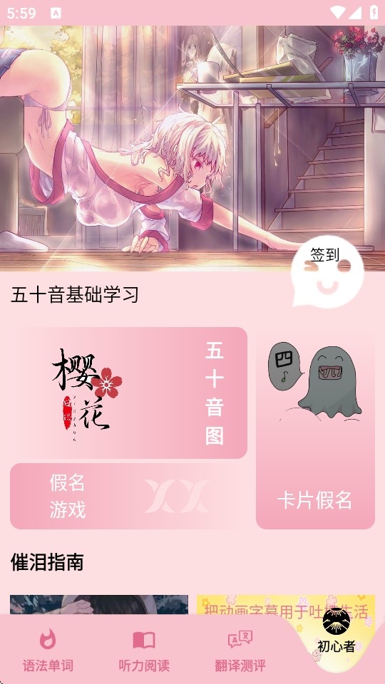 点击初心者,可以看到五十音图的基础学习教程,还有日语学习小游戏