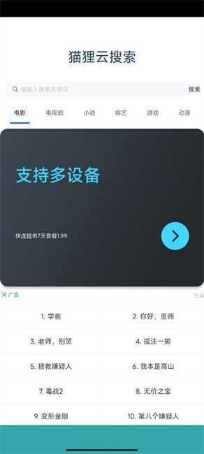 狸猫云搜索是一个搜索神器,不管是文件、小说、视频、游戏app等等都可以搜索到,可以直接输入关键词来找到想要的内容,同时这里还有很多电影和电视剧,你可以直接点击播放。里面的资源下载速度非常快,同时也经过了审核。