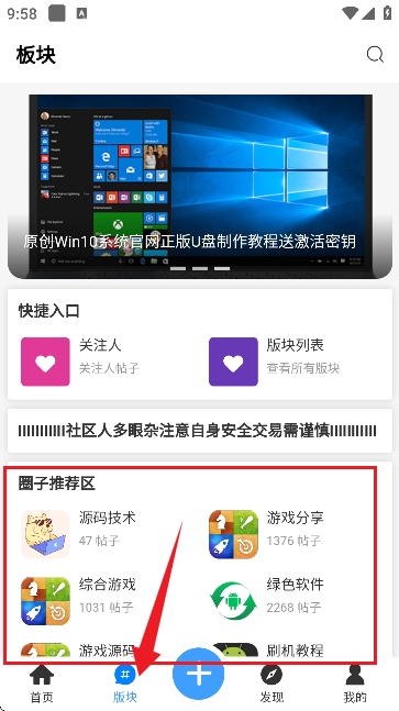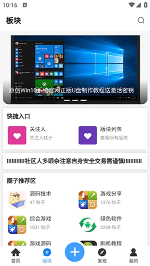 4、板块】中则是有多项兴趣圈子,包含了源码技术,游戏分享,综合游戏,刷机教程,绿色软件等。