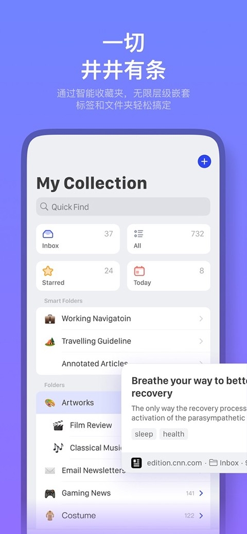 1、自动解析、永久保存收藏的文章会自动解析并永久保存,可随时标注重点,记录想法。