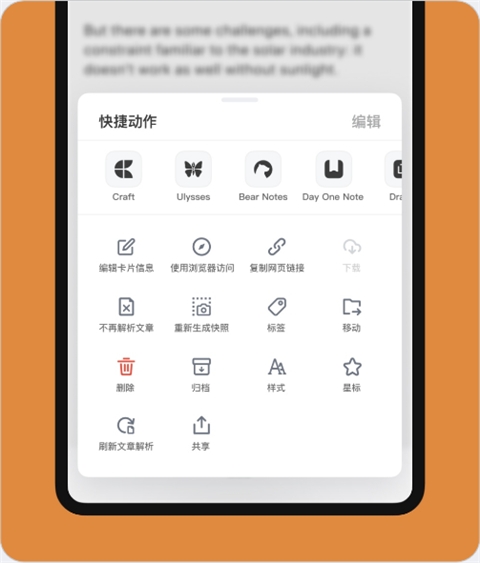 4、自定义动作借助 URLSchemes简单几步创建快捷动作,就能将自定义的数据输出至其它工具 (如笔记、待办等应用)中。