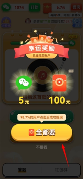 3、猜歌好玩又赚红包,猜对越多赚的越多,考验玩家的歌曲储备!