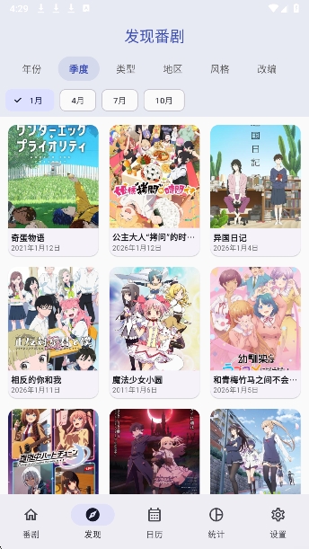 2、用户可以按照季度、种类查看动漫。