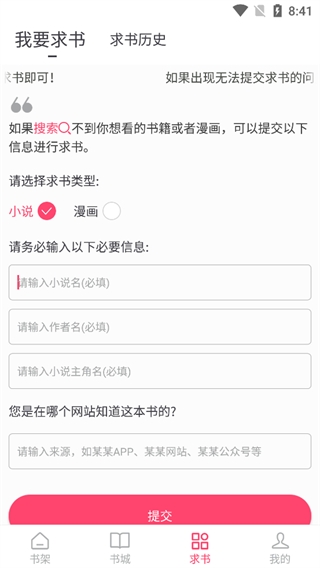 5、如果在小小追书App内查找不到你想看的内容,可以点击求书让作者去添加书籍