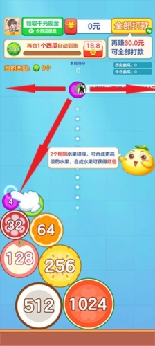 玩家可以左右移动上方水果,对应好下方相同的水果放手即可,水果会自动掉落并且碰撞后自动合成,合成顺序8>16>32>64>128>256>512>1024。