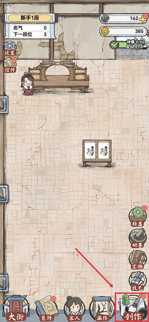 1、双击打开水墨记游戏,你将需要经营一家画室,而经营画室首先需要创作画作,点击右下角创作画作;