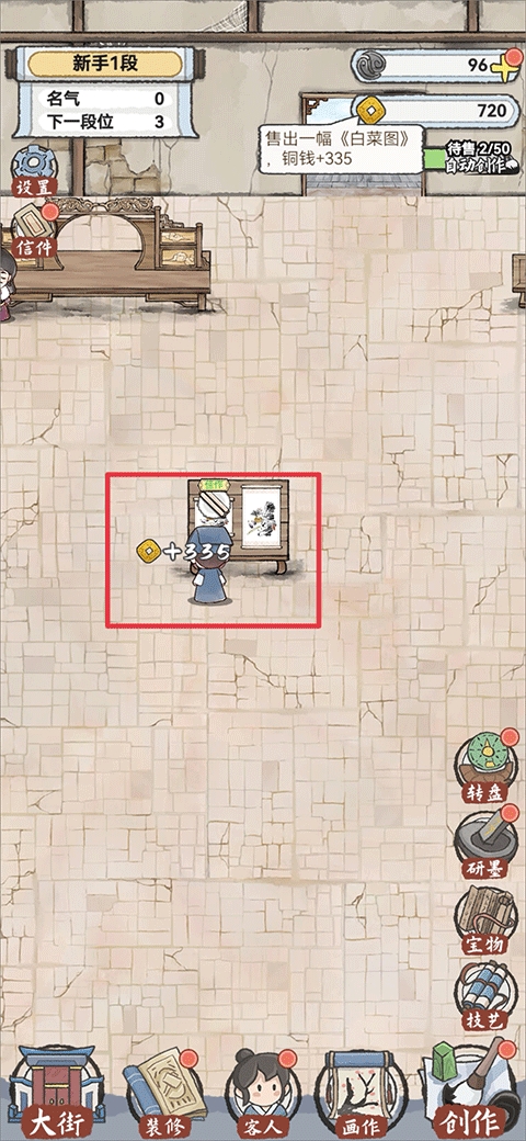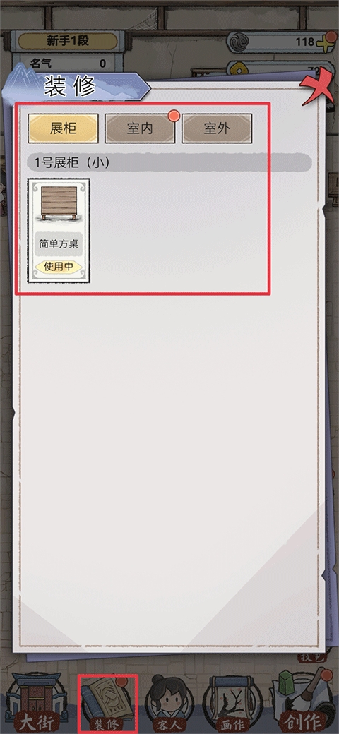 5、画作装裱完成后就可以进行出售啦,出售需要桌子来摆放画作,点击下方菜单栏中的装修可以购买桌子;