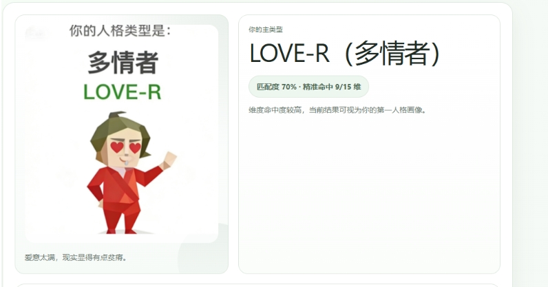 4、结果解析:包含人格标签、特征描述、职业建议及幽默提示,如“该人格适合躺平”。