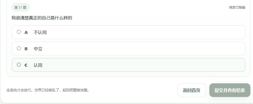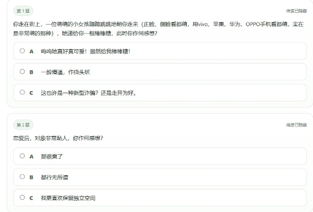 3、题目库:约20道选择题,涵盖情感、社交、生活态度等场景,选项充满戏谑色彩。