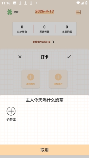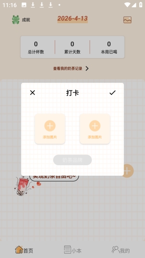 2、手机能够立即一键打卡,记录你的每次奶茶时间,可以从网站上选美图,也可以自己拍照,用起来很方便。