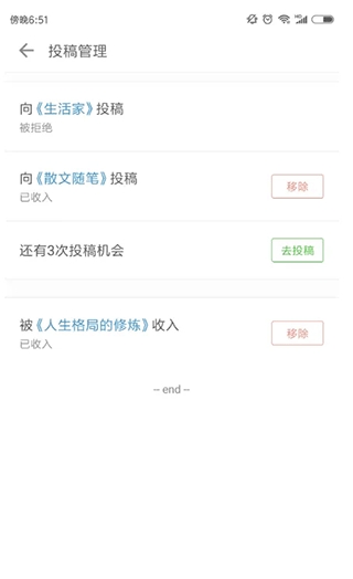 3、打开所要投稿的文章后,点击屏幕右上方的竖排三个冒号的图标,可以看到有一堆下拉菜单。选择【投稿管理】,一般来说,一篇文章有向5个专题投稿的机会,可以同时向多个专题进行投稿哦!