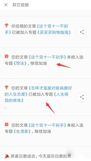 5、向专题投完稿后,接下来的就是要耐心等待。简书专题编辑在收到投稿后会进行审核,并会通过系统消息跟你反馈投稿是否成功。不管投稿是否成功,都能收到编辑们的反馈邮件哦。