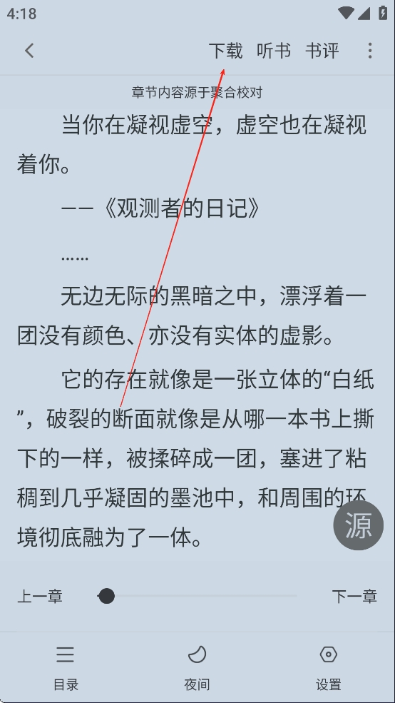 3、进入阅读界面之后,点击屏幕中央唤起功能键,然后点击下载。