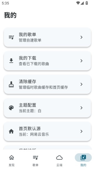 4、点击我的,提供我的歌单、我的下载、清除缓存、主题配置等优质帮助。