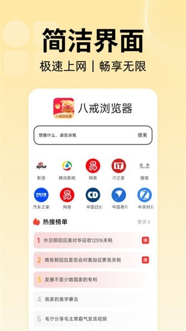 八戒浏览器是一款专为安卓用户打造的轻量级、安全、高速的浏览器应用,全网智能搜索配合海量优质短视频与实时新闻资讯,而且软件还提供了热搜榜单功能,覆盖微博、抖音、bilibili等多个平台,方便大家随时了解最新资讯动态,感兴趣的朋友快来宝贝游戏网下载吧!