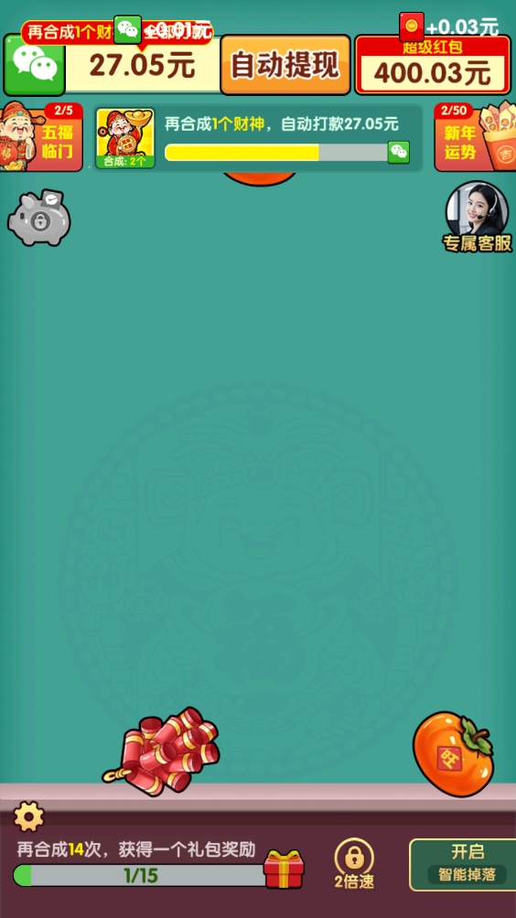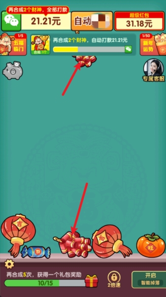 3、通过合成财神就能拿到红包,开启自动模式去合成赚红包