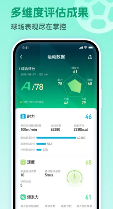 4、运动评估全面深入:从速度、爆发力等5维度深度解读足球比赛表现,以16项核心指标助力赛场表现提升。