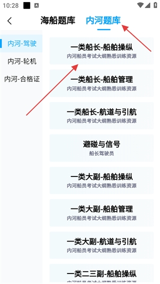 3、若选择内河题库,在左侧列表中选择对应的类别,再在右侧选择具体的科目