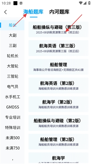2、若选择海船题库,在左侧列表中选择对应的职务,然后在右侧选择具体的科目。