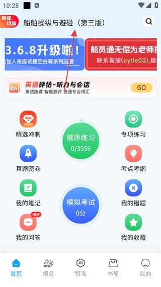 1、打开船员通APP,进入首页后,点击左上角题库切换选项。