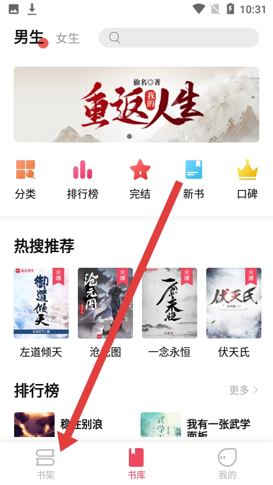 1、打开树莓阅读APP,进入主界面,点击底部导航栏最左侧的书架选项,进入我的书架。