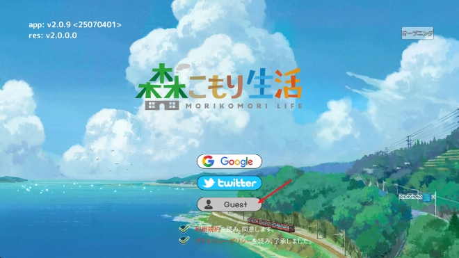 1、第一次进入游戏,我们需要登录账号,如果没有谷歌或者推特账号,我们可以直接用游客身份登录。