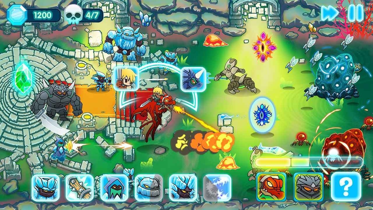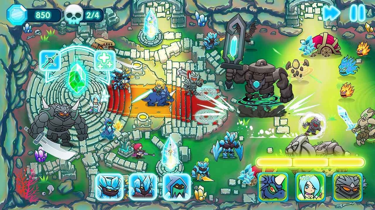 在屏幕的左下角,可以雇佣英雄进行战斗,右下方的可释放的技能,屏幕左边的你需要保护的水晶,右边就是可操作战斗的主角。