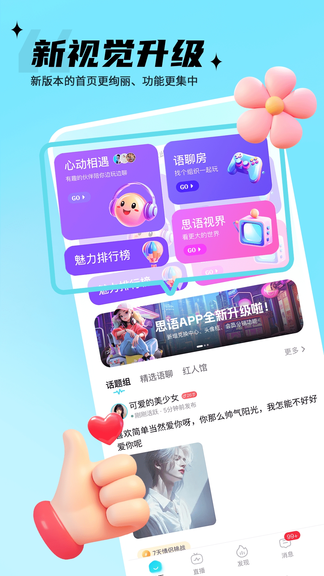 思语是一款安全稳定的聊天通讯软件,可以随时保护用户的个人隐私,在安全性方面已经远超主流通讯工具,他可以对聊天内容进行加密和焚烧,用户可一键开启在线直播,进行直播互动交友。