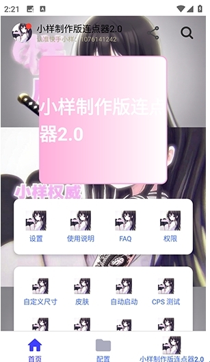小样制作版连点器是一款连点器软件。内置所有功能全部免费,如自动启动、cps测试、自定义尺寸、高级优化设置等等,满足用户的多种使用需求。同时支持用户自定义连点配置,有单点模式、多点模式、同步模式、录制模式,兼容多个安卓设备!