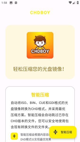 CHDBOY是一款非常好用的chd解压缩软件。玩家无需复杂操作,在手机上就能轻松畅玩PSP游戏,能够自动把ISO、BIN、CUE以及GDI格式的光盘镜像,转换成CHD格式,打开你就能轻松的选择各种游戏玩耍。