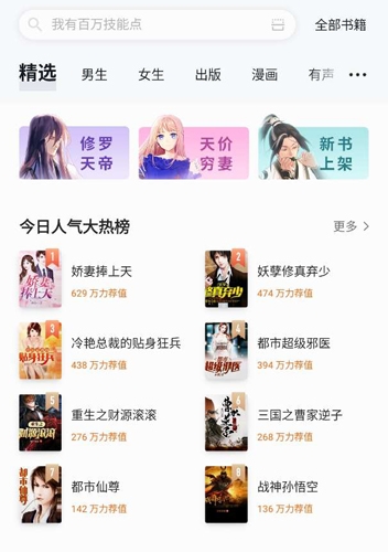 大家可以在软件的书城首页中看到今日人气大热榜,点击更多就可以看到更多分类更广的榜单。