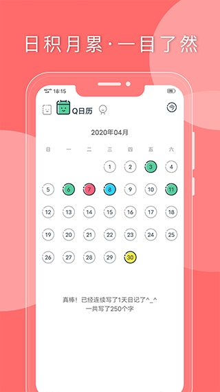 为用户呈现每日的心情颜色,还显示日记的天数和字数,帮助用户养成写日记的好习惯。