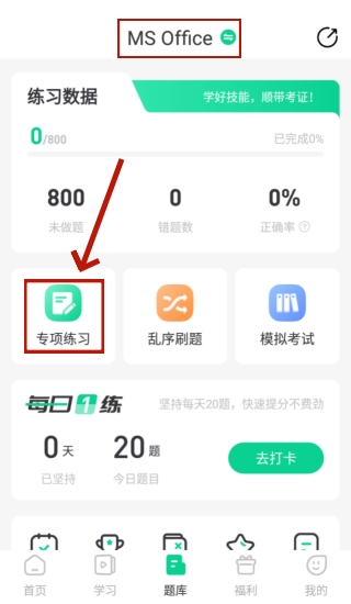 2、在界面上方切换您需要刷题的类型,这里以计算机二级MS Office为例,接着点击“专项练习”。