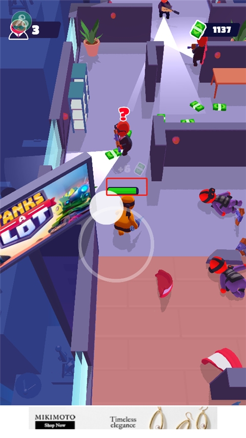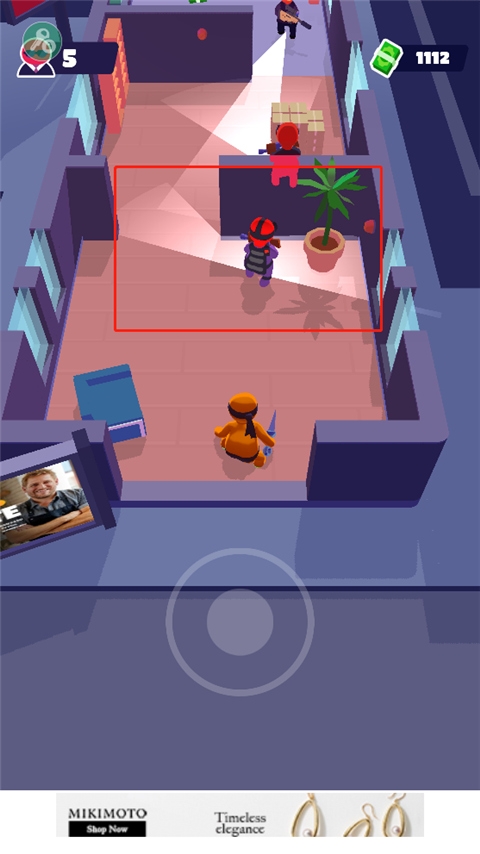 2、光线涉及的地方就是敌人的监控区域,玩家只需要避开,敌人就不会攻击你,而玩家只需悄悄靠近就能够收割小喽啰获得钞票奖励;