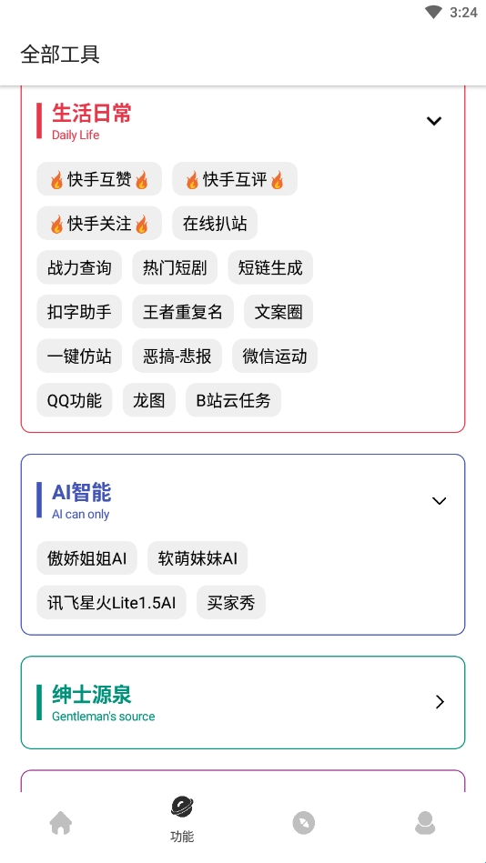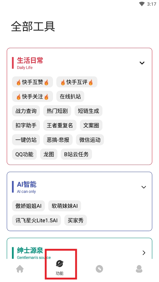 9、在功能界面可以找到生活日常工具(如天气预报等)和AI智能工具(如智能问答等)。
