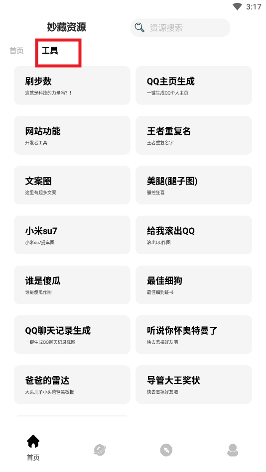 8、在工具界面可以找到刷步数、QQ主页生成、王者重复名、网站功能等特殊工具。