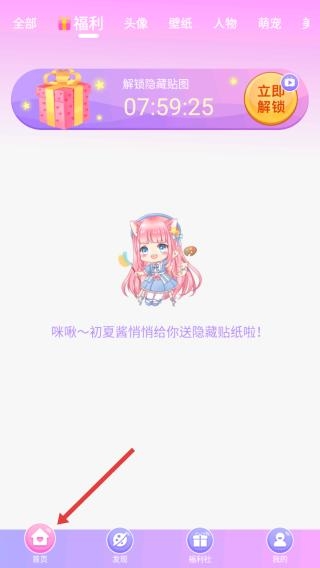 首页操作:打开应用进入首页,顶部设有分类栏与隐藏贴图解锁倒计时,可爱动漫角色视觉吸睛,底部导航栏支持快捷功能切换。