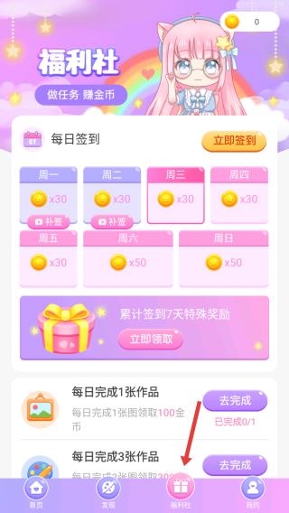 福利页互动:福利页设有每日签到与作品完成任务,签到可累积金币,达成累计签到还能获取特殊奖励。