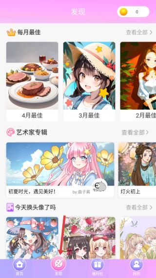 发现页浏览:点击进入发现页,包含「每月最佳」等板块,集中展示美食与动漫人物插画,提供不同视觉的内容。