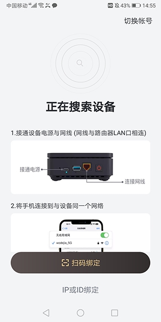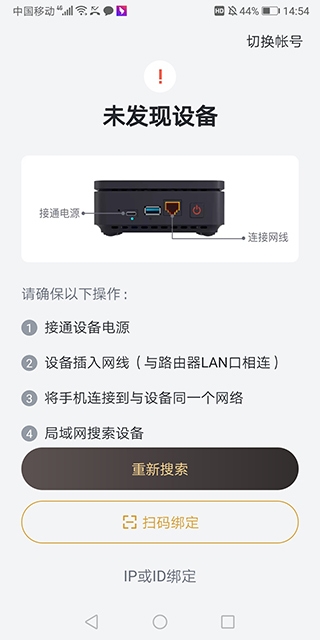2.若未搜到,可点击【重新搜索】或扫码、输入设备ip地址手动绑定。