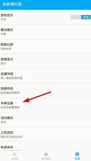 3、进入海星模拟器后,在“设置”菜单中点击“手柄设置”选项。