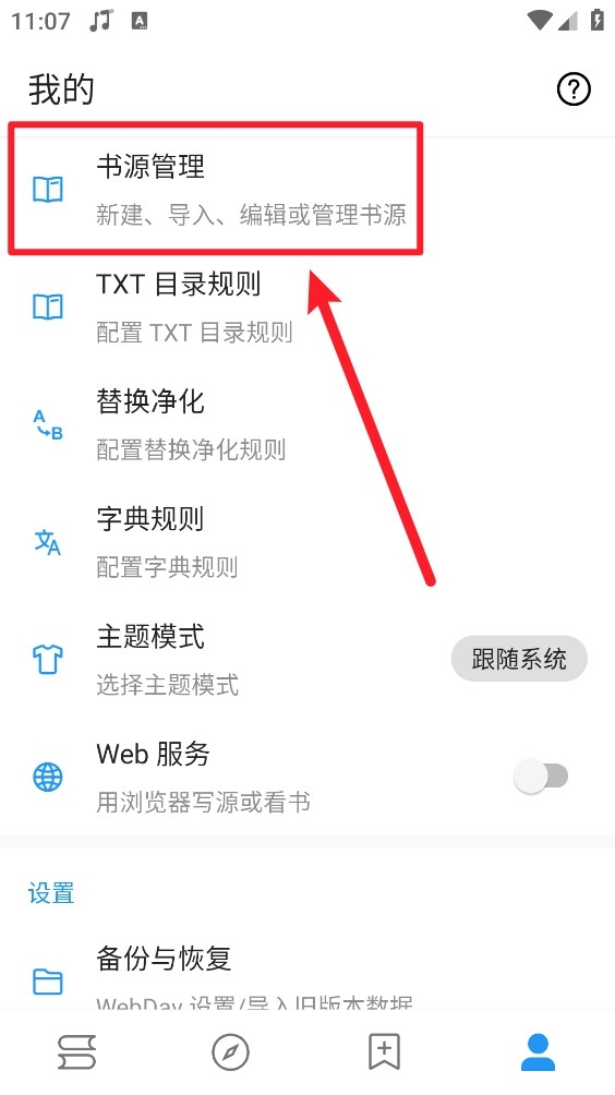 1、进入书源管理界面:打开蓝潮阅读App,点击底部“我的”菜单,选择“书源管理”功能,进入书源配置页面。