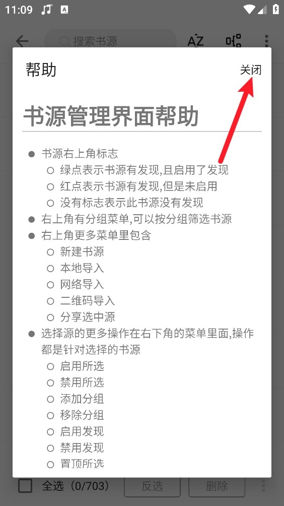 3、启用所选书源:导入书源后,可在书源管理界面勾选需要的书源,或直接搜索框输入关键词精准检索书源,勾选完成后点击右侧三点,选择“启用所选”即可开始使用。