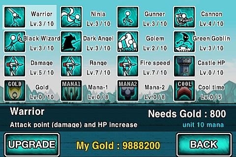 1、主城配有强大的弩箭抵御敌人,魔法祭坛生产各类火柴人英雄进行进攻。