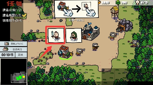 2、点击刚刚建好的兵营来生产一个剑士出来。